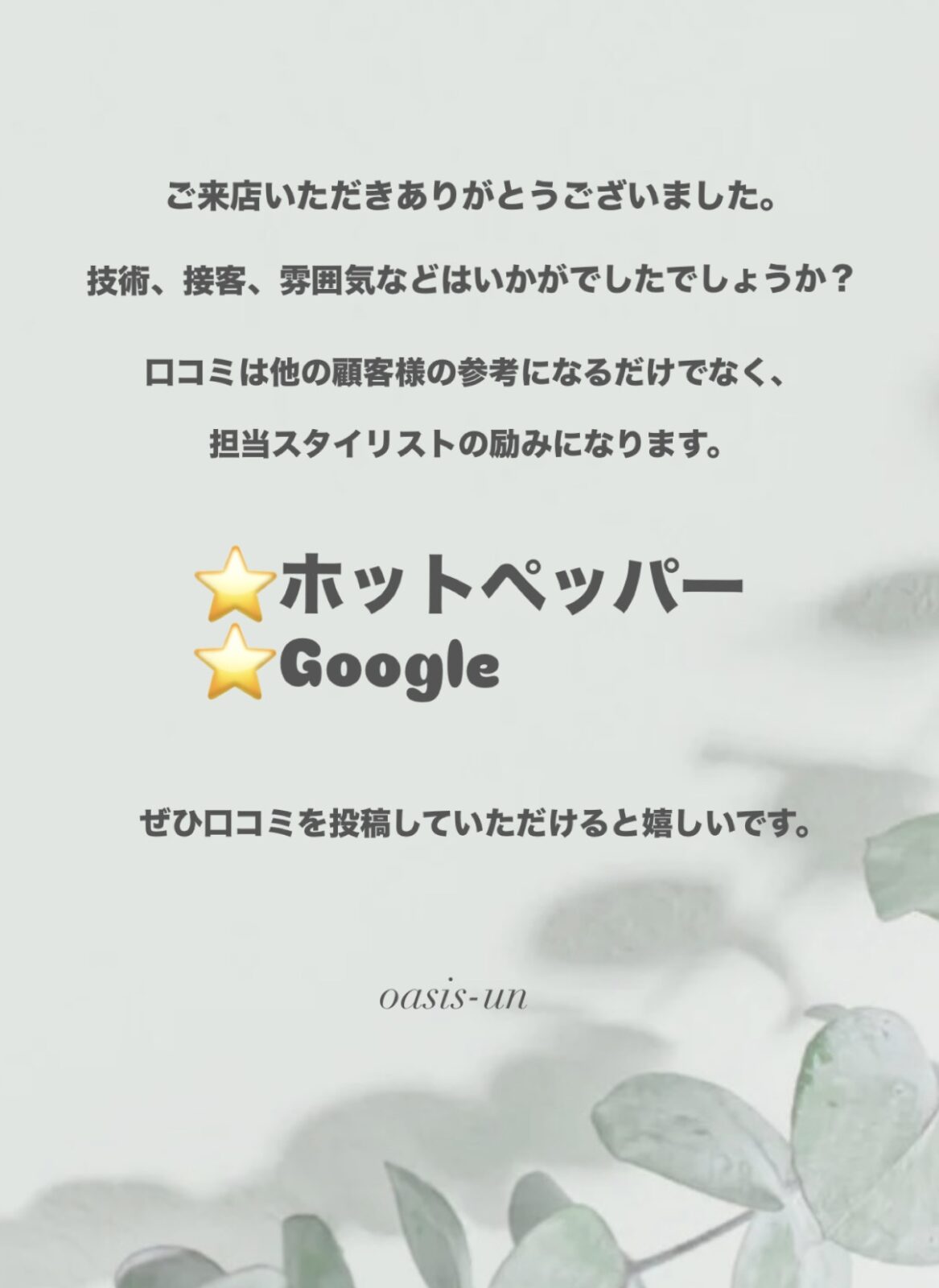ナチュラルなツヤ感、自然でなめらかな指通り、お手入れが楽、オシャレで旬なスタイル。「何かかわいい」「何かカッコいい」「何かオシャレ」「何かやりやすい」oasis-unはお客様1人1人の「何か」を形にし、表現するのが得意なサロンです。