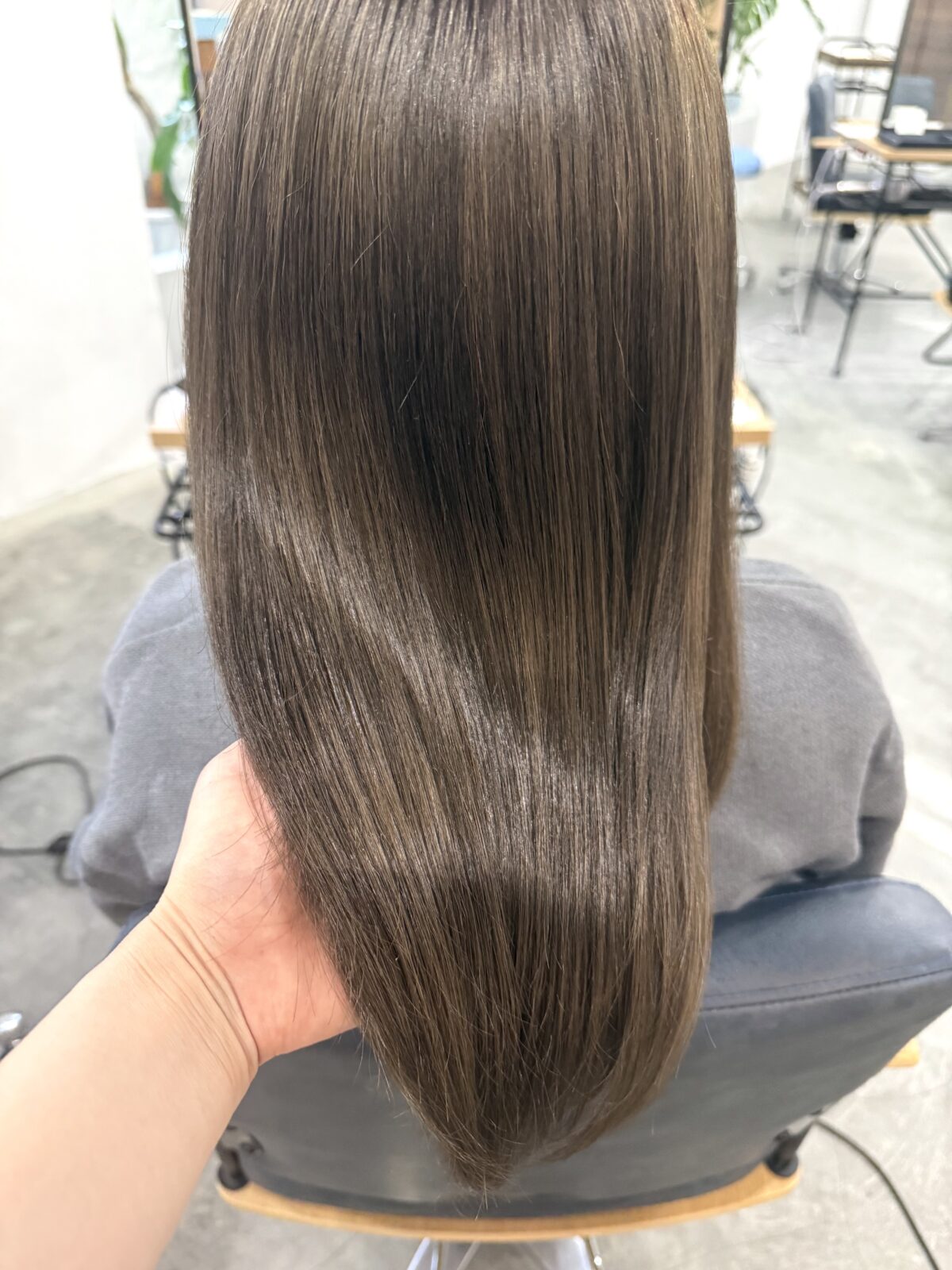 コンクリートをベースに、水色と観葉植物の緑が映える店内。開放感のあるシンプルな空間で、リラックスしながらお過ごしいただけます。髪がキレイになって、少し気分が上がる。そんな時間をお届けできたら嬉しいです。