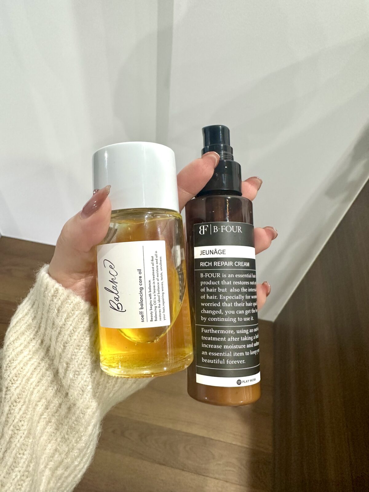 まず右側のリッチリペアクリームで水分補給と栄養補給をして、左側のオイルで更にコーティング艶出しをします✨